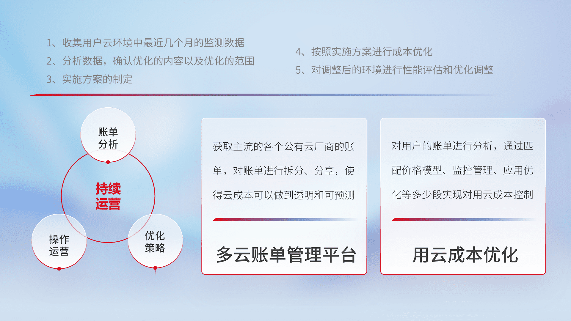 通过多云纳管,,,以统一的资源数据模型把客户的云资源进行抽象和封装,,,进而实现对多云资源的统一操作,,,保障云资源管理的可靠性、、稳定性与可用性。。。。量身定制化运维内容,,,,配置、、开发运维、、、、补丁管理、、、备份、、、监控、、、、认证和访问管理、、审计和日常巡检等,,,,保障在用云过程中的可靠度,,,,稳定度以及高可用率。。。
